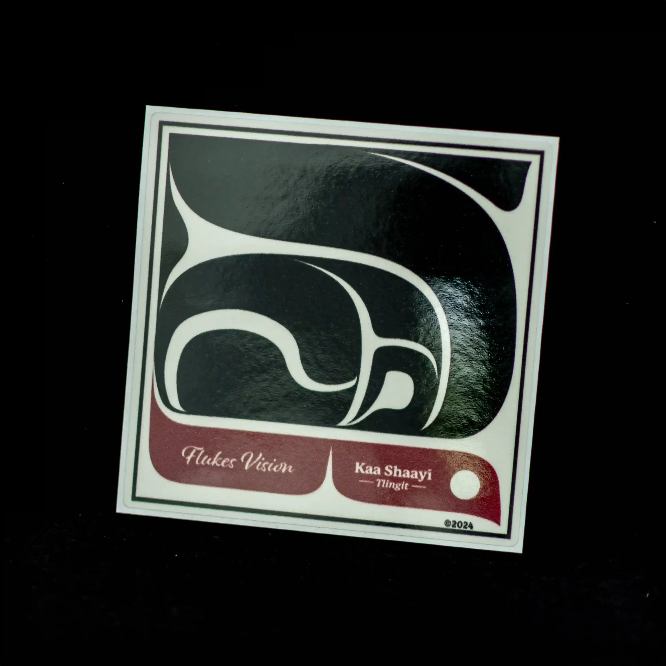 Flukes Vision design featuring the signature Questioning Eye surrounded by sweeping curvilinear forms, with the overall shape suggesting a whale’s powerful fluke breaking the water’s surface, rendered in traditional Tlingit colors. Premium 3M vinyl sticker with glossy laminate finish for water and UV resistance. Precision die-cut for easy application. Perfect for laptops, water bottles, cars, and more.